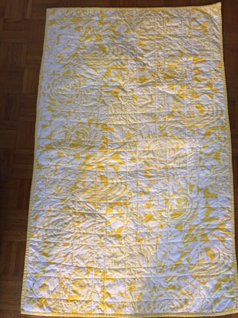 This gorgeous backing was found at Mood Fabric. The binding was yellow fabric with small white dots found locally.