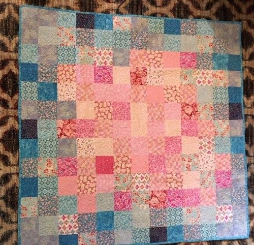 Finished in October 2018. Melody came with a beautiful selection of fabrics to work with, the goal was to get the pink to fade into the teal. Melody wanted tight quilting on this one,