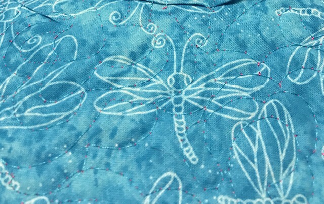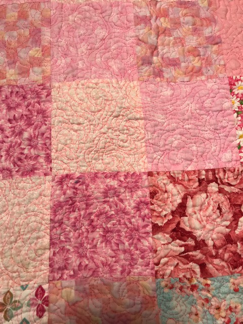 A tight flower abstractions design was quilted. Dark pink thread on top and a teal blue on back. Different color thread on top and bottom is generally not recommended unless sure of thread tension because the top or bottom thread can peek through.