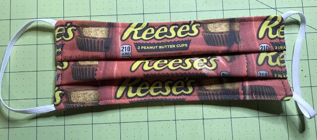 The last one was my most creative — using inkjet print fabric and several packages of Reese’s cups. I laid the Reese’s cups in package on glasses copier. Note do not eat the peanut butter cups first. Put the printing fabric in tray as instructed on packet. Print, let dry, sew according to Jenny’s instructions, lastly enjoy the peanut butter cups.