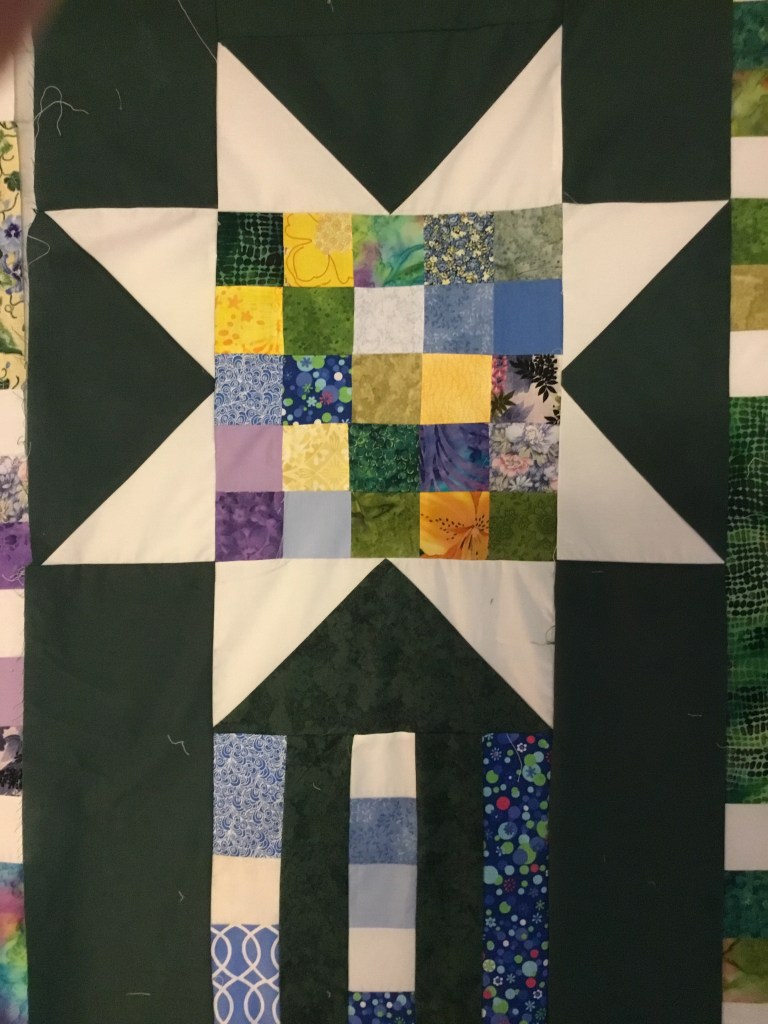 I ended up changing the streamers and the points at tip of the trailers. They are mottled green. I have enough mottled green to do the binding. A happy ending except, I have added at least a yard of mottled green fabric to my stash. The moral of the story is be sure I have the pattern with me when shopping.