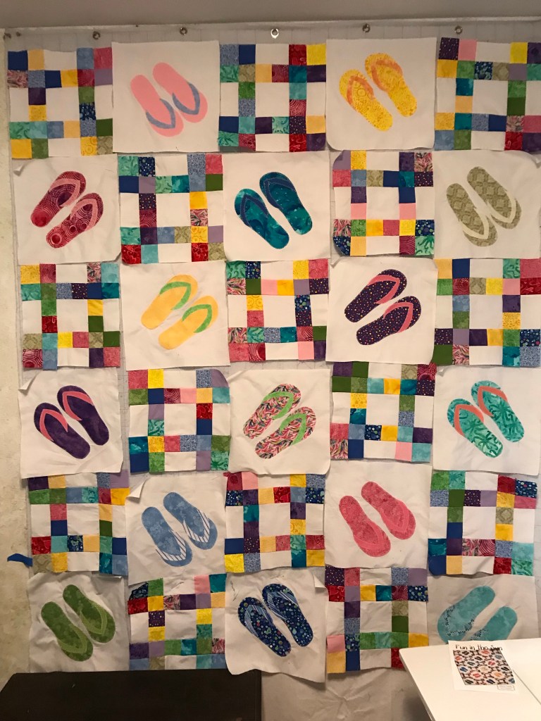 Progress. I finished blanket stitching the flip flops. I have arranged everything on the design wall to get a peak at what the top will look like.