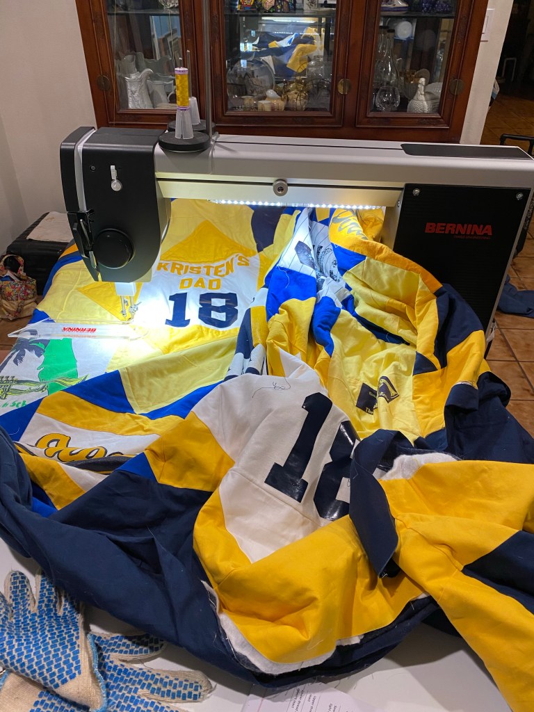 I used the straight ruler to stitch the quilt I have been working on. The quilt is made of high school sport t-shirts of my son’s girlfriend. The pattern is by The Midnight Quilter. The quilt was commissioned by her mom.
